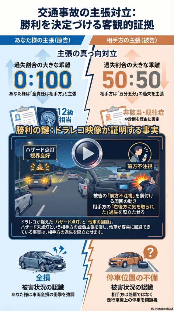まずは相手側はなんと!事故当時、原告(私)は視界不良な環境でハザードランプも付けておらず、車両は路肩にも寄せておらず、なおかつガードレール外側の安全な場所に居なかったと主張しており、びっくり!!
