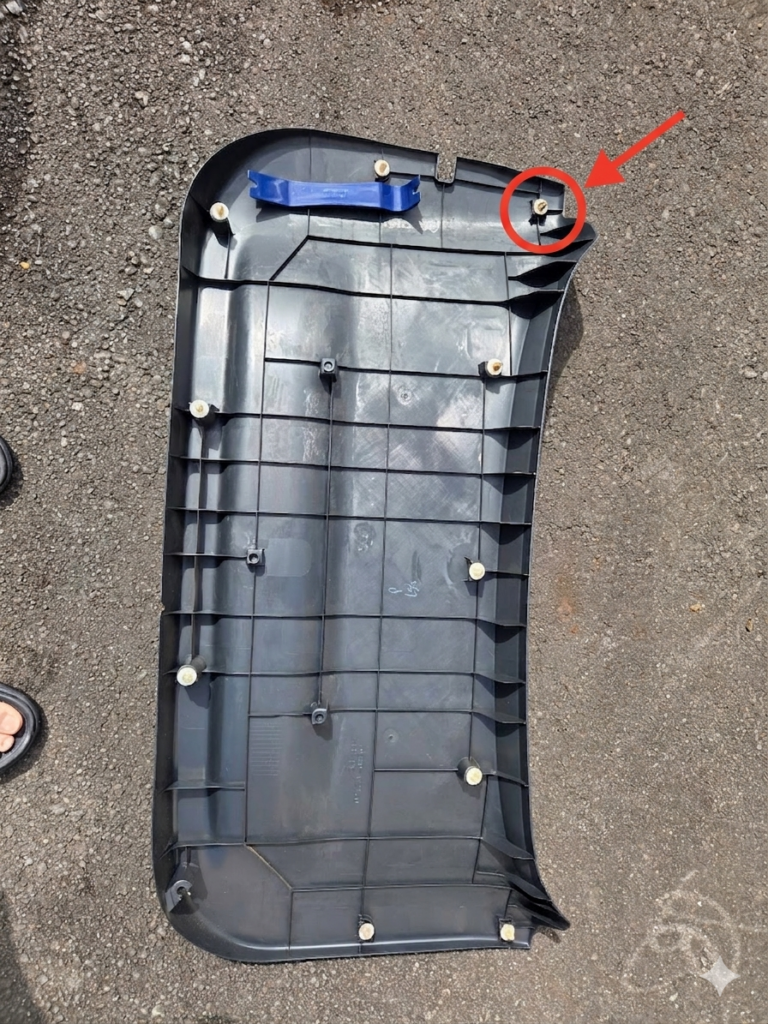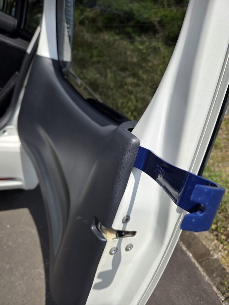 内張り外しをクリップが有るであろう箇所に当ててこじると、「パキッ」っと音がして外れます。全部で11ヶ所あるので、無理に外さず少しずつ順番にこじって外します。